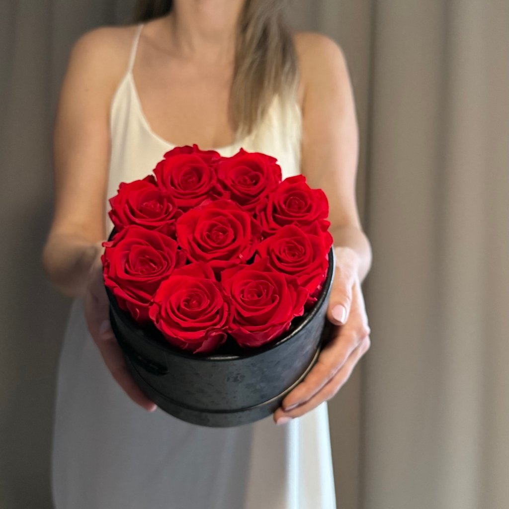 Černý Lovely Box - Červené růže: Lovely Box s devíti červenými růžemi v černém boxu je dramatický a vášnivý, skvělý pro vyjádření lásky. Červené růže v černém boxu jsou silným symbolem lásky a vášně, vhodné pro romantické překvapení. Stabilizované - věčné růže jsou přírodní růže, které byly speciálně ošetřeny, aby si uchovaly svůj vzhled a čerstvost po dlouhou dobu.