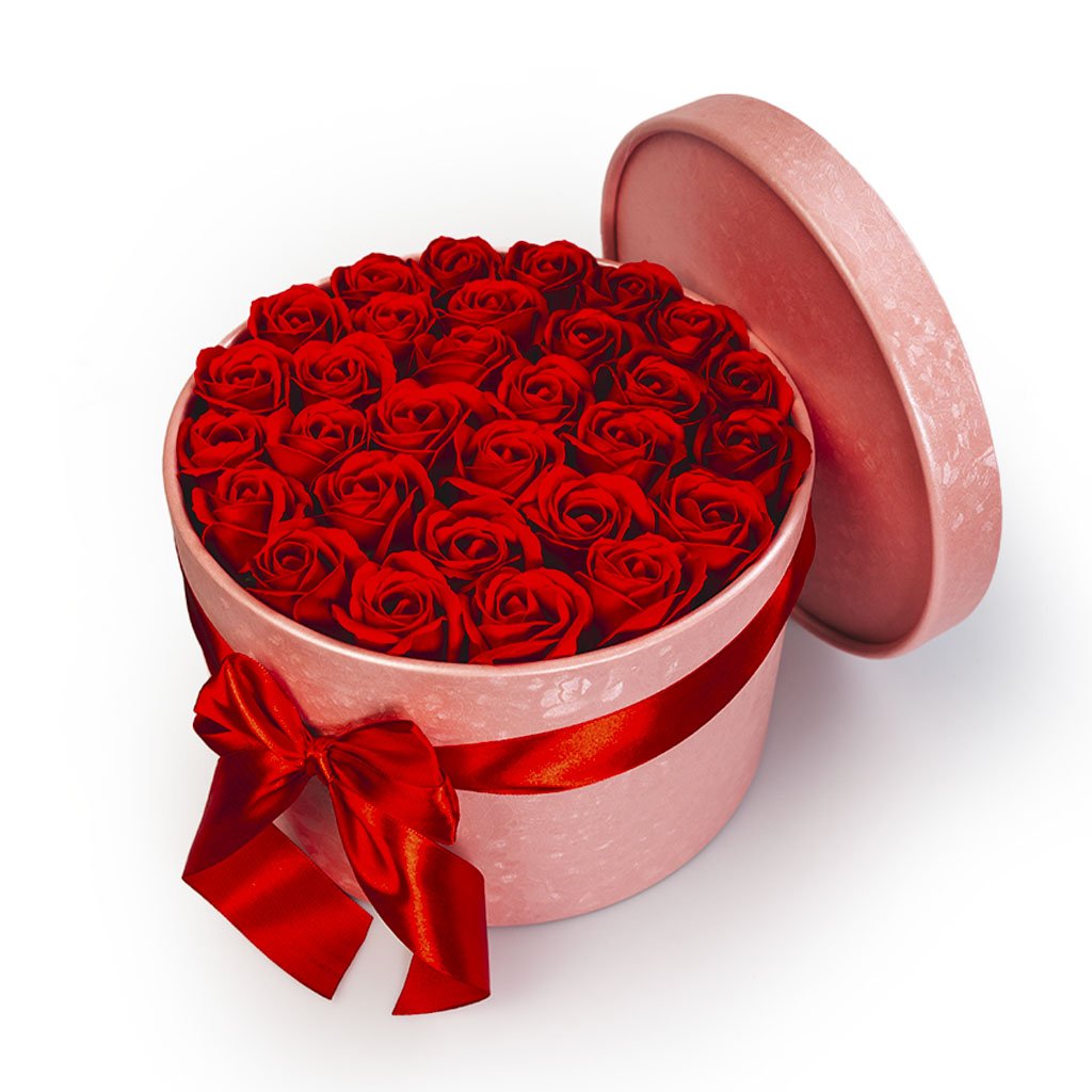 Červené mýdlové růže v růžovém flower boxu - 29 růží
