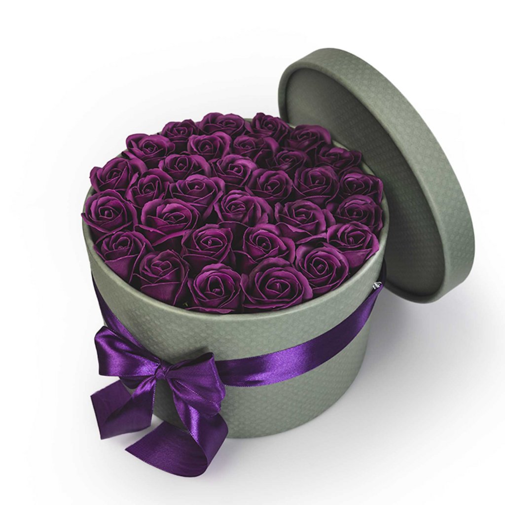 Fialové mýdlové růže v květinovém khaki boxu - 29 růží